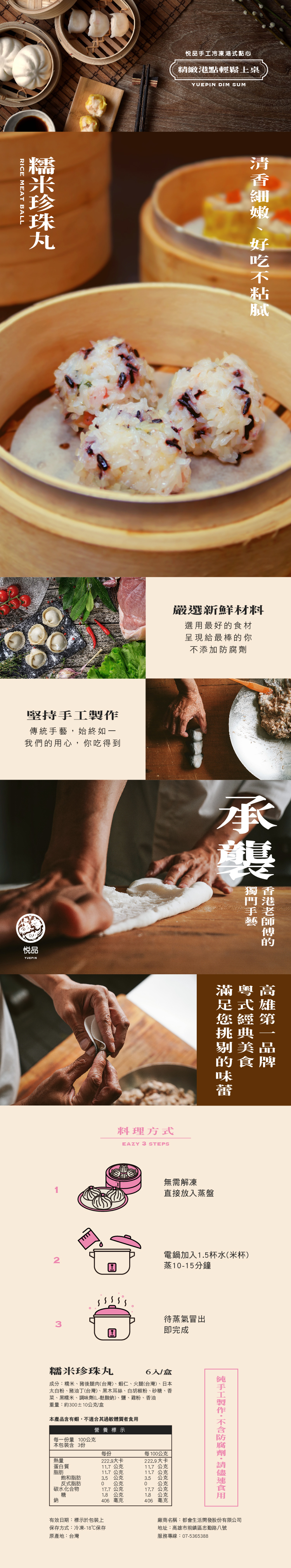 成份:糯米、豬後腿肉(台灣)、蝦仁、火腿(台灣)、日本太白粉、豬油丁(台灣)、黑木耳絲、白胡椒粉、砂糖、香菜、黑糯米、調味劑(L-麩酸鈉)、鹽、雞粉、香油