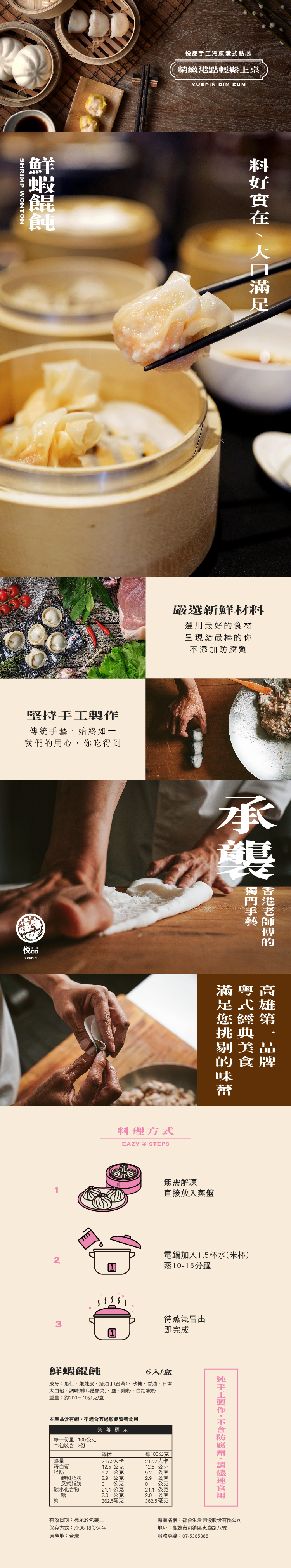 成份:蝦仁、餛飩皮、豬油丁(台灣)、砂糖、香油、日本太白粉、調味劑(L-麩酸鈉)、鹽、雞粉、白胡椒粉